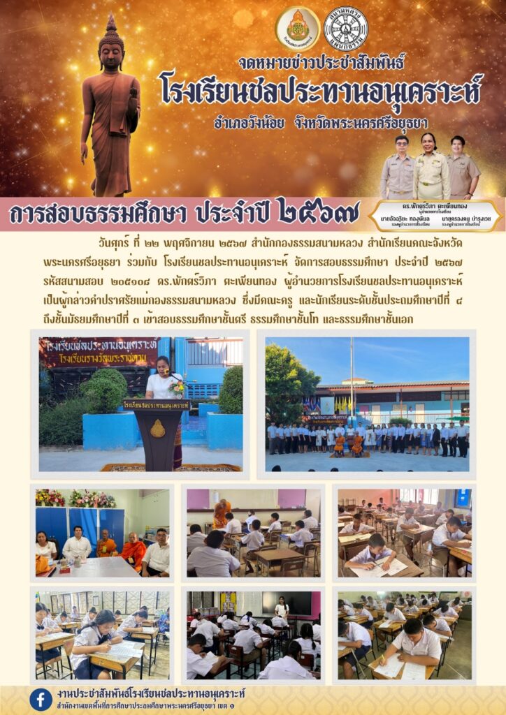 วันศุกร์ ที่ ๒๒ พฤศจิกายน ๒๕๖๗ สำนักกองธรรมสนามหลวง สำนักเรียนคณะจังหวัดพระนครศรีอยุธยา ร่วมกับ โรงเรียนชลประทานอนุเคราะห์ จัดการสอบธรรมศึกษา ประจำปี ๒๕๖๗ รหัสสนามสอบ ๒๐๕๑๐๘ ดร.พักตร์วิภา ตะเพียนทอง ผู้อำนวยการโรงเรียนชลประทานอนุเคราะห์ เป็นผู้กล่าวคำปราศรัยแม่กองธรรมสนามหลวง ซึ่งมีคณะครู และนักเรียนระดับชั้นประถมศึกษาปีที่ ๔ ถึงชั้นมัธยมศึกษาปีที่ ๓ เข้าสอบธรรมศึกษาชั้นตรี ธรรมศึกษาชั้นโท และธรรมศึกษาชั้นเอก
