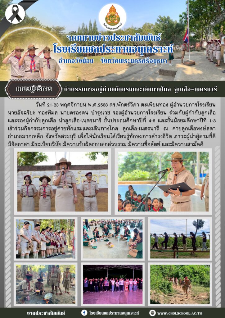 วันที่ 21-23 พฤศจิกายน พ.ศ.2568 ดร.พักตร์วิภา ตะเพียนทอง ผู้อำนวยการโรงเรียน นายอัจฉริยะ ทองพิมล นายครองคน บำรุงเวช รองผู้อำนวยการโรงเรียน ร่วมกับผู้กำกับลูกเสือ และรองผู้กำกับลูกเสือ นำลูกเสือ-เนตรนารี ชั้นประถมศึกษาปีที่ 4-6 และชั้นมัธยมศึกษาปีที่ 1-3 เข้าร่วมกิจกรรมการอยู่ค่ายพักแรมและเดินทางไกล ลูกเสือ-เนตรนารี ณ ค่ายลูกเสือพงษ์ลดา อำเภอมวกเหล็ก จังหวัดสระบุรี เพื่อให้นักเรียนได้เรียนรู้ทักษะการดำรงชีวิต ภาวะผู้นำผู้ตามที่ดี มีจิตอาสา มีระเบียบวินัย มีความรับผิดชอบต่อส่วนรวม มีความซื่อสัตย์ และมีความสามัคคี