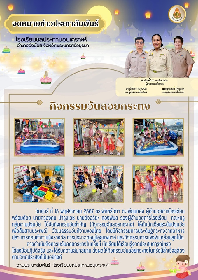 วันศุกร์ที่ 15 พฤศจิกายน พ.ศ. 2567 นำโดย ดร.พักตร์วิภา ตะเพียนทอง ผู้อำนวยการโรงเรียน นายครองคน บำรุงเวช นายอัจฉริยะ ทองพิมล รองผู้อำนวยการโรงเรียน คณะครูกลุ่มงานปฐมวัย ได้จัดกิจกรรมวันลอยกระทง ประจำปี 2567 ให้นักเรียนระดับปฐมวัย เพื่อสืบสานประเพณีไทย โดยมีกิจกรรมการประดิษฐ์กระทงจากอาหารปลา การประกวดหนูน้อยนพมาศ การแข่งขันเหยียบลูกโป่ง และการตอบคำถามชิงของรางวัล เพื่อเป็นการส่งเสริมและสืบทอดประเพณีวันลอยกระทงให้คงอยู่สืบไป