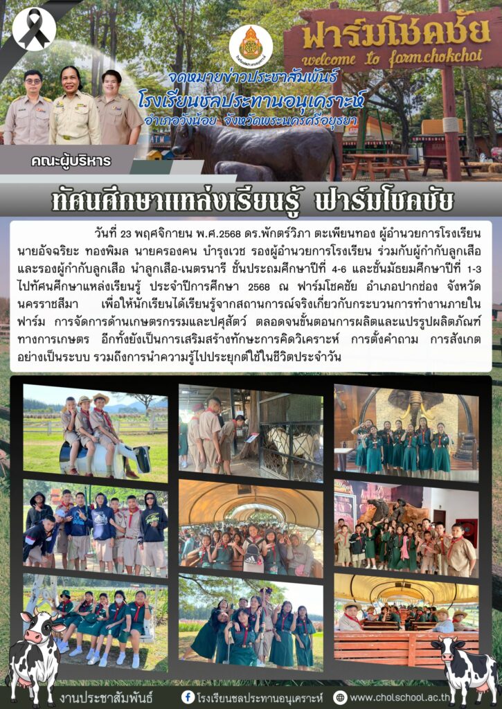 วันที่ 23 พฤศจิกายน พ.ศ.2568 ดร.พักตร์วิภา ตะเพียนทอง ผู้อำนวยการโรงเรียน นายอัจฉริยะ ทองพิมล นายครองคน บำรุงเวช รองผู้อำนวยการโรงเรียน ร่วมกับผู้กำกับลูกเสือ และรองผู้กำกับลูกเสือ นำลูกเสือ-เนตรนารี ชั้นประถมศึกษาปีที่ 4-6 และชั้นมัธยมศึกษาปีที่ 1-3 ไปทัศนศึกษาแหล่งเรียนรู้ ประจำปีการศึกษา 2568 ณ ฟาร์มโชคชัย อำเภอปากช่อง จังหวัดนครราชสีมา เพื่อให้นักเรียนได้เรียนรู้จากสถานการณ์จริงเกี่ยวกับกระบวนการทำงานภายในฟาร์ม การจัดการด้านเกษตรกรรมและปศุสัตว์ ตลอดจนขั้นตอนการผลิตและแปรรูปผลิตภัณฑ์ทางการเกษตร อีกทั้งยังเป็นการเสริมสร้างทักษะการคิดวิเคราะห์ การตั้งคำถาม การสังเกตอย่างเป็นระบบ รวมถึงการนำความรู้ไปประยุกต์ใช้ในชีวิตประจำวัน
